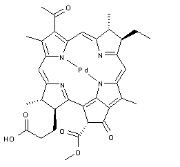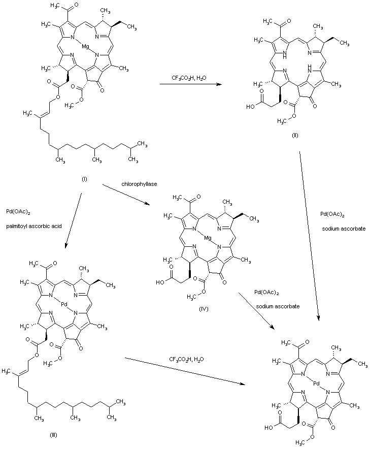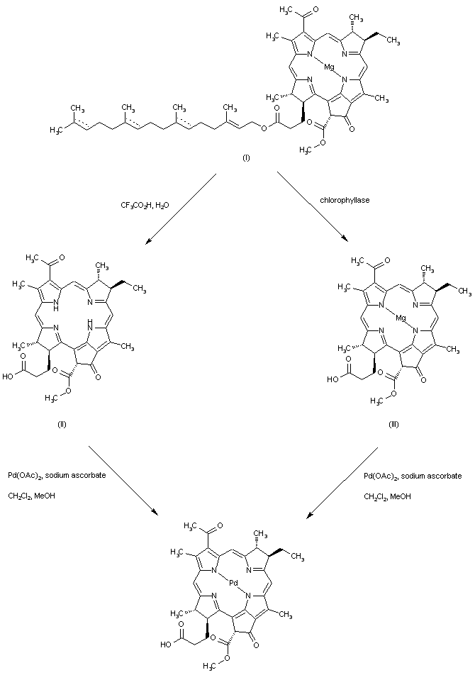 Bacteriochlorophyll a (I) was isolated from the lyophilized bacteria Rhodovolum sulfidophilum. From this, the title compound was obtained by several methods. Hydrolysis of the C-17 ester group and simultaneous demetalation by means of 80% aqueous trifluoroacetic acid provided bacteriopheophorbide (II). This was then complexed with palladium acetate in the presence of sodium ascorbate to produce the title compound. In a related procedure, transmetalation of (I) with palladium acetate in the presence of 6-O-palmitoyl-L-aspartic acid led to the corresponding palladium complex (III), which was then hydrolyzed to the title compound in aqueous trifluoroacetic acid. An alternative method consisted of the initial hydrolysis of the 17-C ester group of (I) by means of the enzyme chlorophyllase to afford acid (IV), and then transmetalation with palladium acetate.