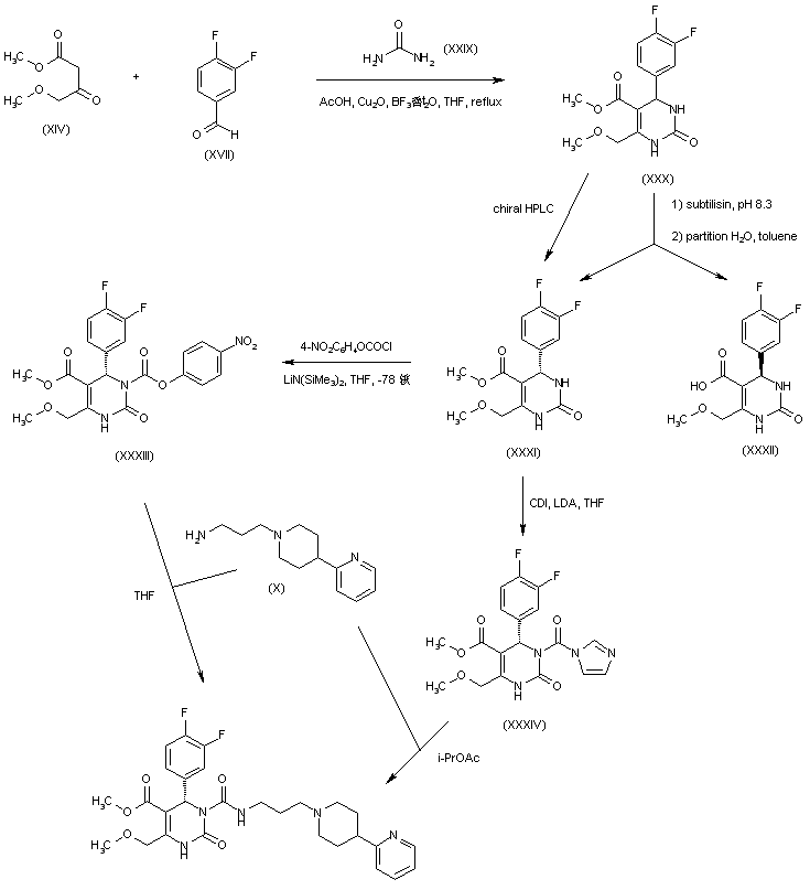 In a related synthetic method, condensation between 4-methoxyacetoacetate (XIV), 3,4-difluorobenzaldehyde (XVII) and urea (XXIX) in the presence of copper acetate and boron trifluoride etherate furnished the racemic pyrimidinone (XXX). Enzymatic resolution of (XXX) by incubation with subtilisin yielded a separable mixture of the (R)-acid (XXXII) and the unreacted (S)-ester (XXXI). Alternatively, the (S)-enantiomer (XXXI) was isolated by chiral preparative HPLC. Pyrimidinone (XXXI) was activated by conversion to either aryl carbamate (XXXIII) using 4-nitrophenyl chloroformate or to imidazolide (XXXIV) with carbonyl diimidazole. Finally, coupling of the intermediate amine (X) with either the carbamate (XXXIII) or the imidazolide (XXXIV) furnished the title compound.