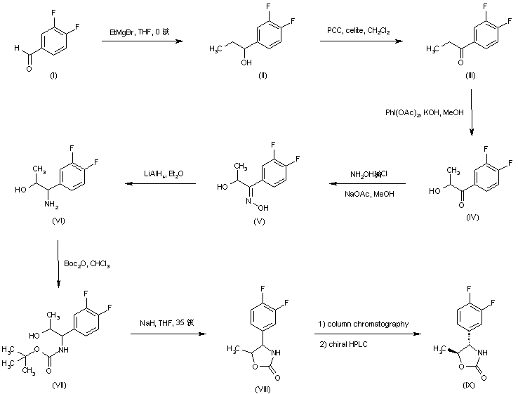 The addition of ethylmagnesium bromide to 3,4-difluorobenzaldehyde (I) gave alcohol (II), which was oxidized to ketone (III) by using pyridinium chlorochromate. Treatment of (III) with iodobenzene diacetate in methanolic KOH produced the hydroxy ketone (IV). This was converted to oxime (V) and subsequently reduced with LiAlH4, yielding amino alcohol (VI) as a mixture of diastereoisomers. The mixture of amino alcohols (VI) was treated with Boc2O to afford carbamate (VII), which was then cyclized in the presence of NaH in THF. The resulting diastereomeric mixture of oxazolidinones (VIII) was first separated by column chromatography, and the racemic trans-isomer was then resolved by means of chiral HPLC to provide the required (+)-trans-oxazolidine (IX).