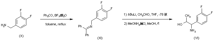 In an alternative procedure, 3,4-difluorobenzylamine (X) was condensed with benzophenone in the presence of a catalytic amount of boron trifluoride etherate to afford imine (XI). After deprotonation of (XI) with tert-butyllithium, its condensation with acetaldehyde produced a protected amino alcohol, which was then deprotected by treatment with O-methyl hydroxylamine. The resulting amino alcohol (VI) was converted to oxazolidine (IX) by the same method as above.
