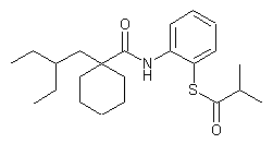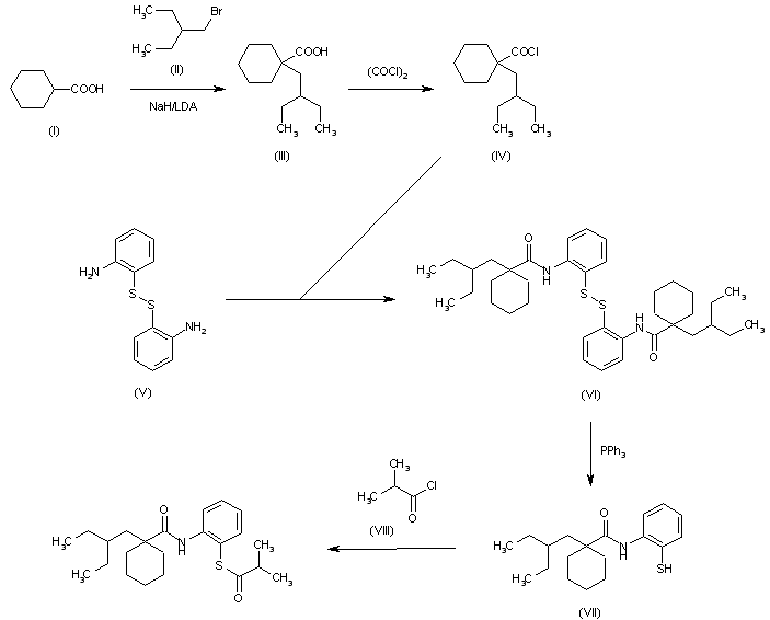 Cyclohexanecarboxylic acid (I) is condensed with 1-bromo-2-ethylbutane (II) by means of lithium diisopropylamide (LDA) (NaH can also be added ) in THF or THF/cyclohexane to afford derivative (III). Treatment of carboxylic acid (III) with oxalyl chloride in CH2Cl2 (a small amount of DMF can be added) yields acid chloride (IV), which is then coupled with bis(2-aminophenyl) disulfide (V) in pyridine to provide disulfide derivative (VI). Reduction of the disulfide bond of (VI) with PPh3 in dioxane/H2O gives benzenethiol (VII), which is finally coupled with isobutyryl chloride (VIII) in pyridine/CHCl3 to furnish the target compound.
