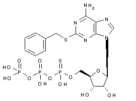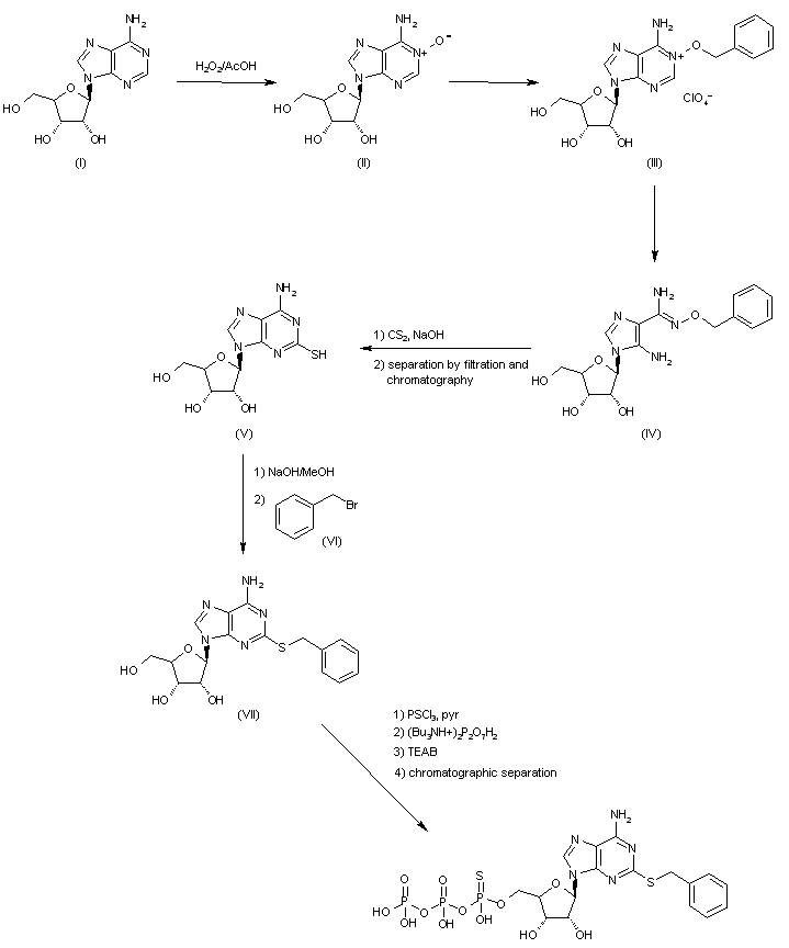 Treatment of adenosine (I) with H2O2 and HOAc affords N-oxide (II), which is converted into the benzyloxime (IV) via N-benzyloxyadenosine perchlorate (III). Treatment of (IV) with CS2 and NaOH in MeOH followed by separation by filtration and chromatography yields 2-thioadenosine (V), which is then converted into the sodium thiolate salt by treatment with NaOH in MeOH and condensed with benzylbromide (VI) in DMF, providing derivative (VII). Finally, conversion of (VII) into the target compound is achieved by following these steps: (i) treatment of (VII) with thiophosphoryl chloride (PSCl3) in pyridine; (ii) addition of a mixture of Bu3N and (Bu3NH+)2P2O7H2 in DMF; and (iii) treatment with TEAB and chromatographic separation of regioisomers.