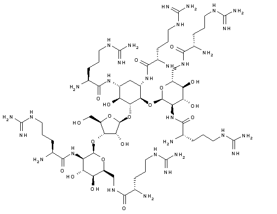 Acylation of neomycin B (I) with N-alpha-carbobenzoxy-N-omega-nitro-L-arginine (II) by means of EDC affords the protected neomycin B hexa-amide (III). Removal of the N-carbobenzoxy and N-nitro protecting groups of (III) is then achieved by catalytic hydrogenation over Pd/C, to furnish the title compound.