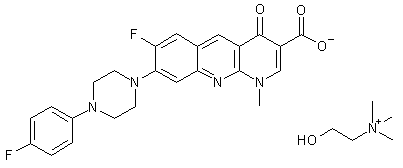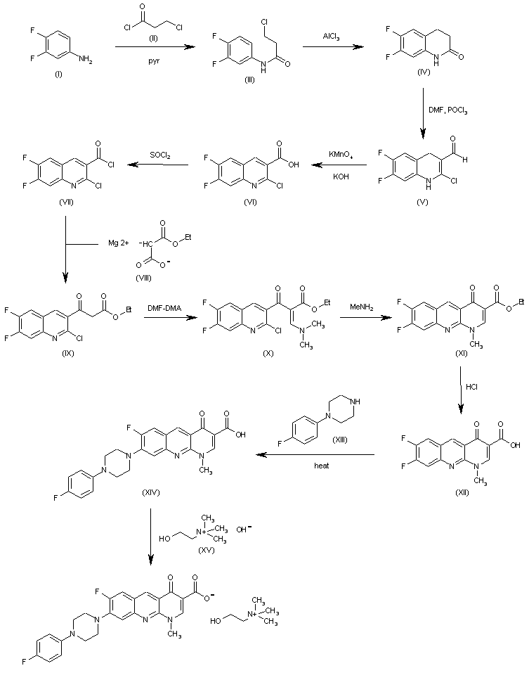 The condensation of 3,4-difluoroaniline (I) with 3-chloropropionyl chloride (II) and pyridine in hot acetone give the anilide (III), which is cyclized by means of AlCl3 at 110?C, yielding 6,7-difluoro-1,2,3,4-tetrahydroquinolin-2-one (IV). The reaction of (IV) with POCl3 and dimethylformamide affords the carbaldehyde (V), which is oxidized and aromatized by means of KMnO4 and KOH in water, providing 2-chloro-6,7-difluoroquinoline-3-carboxylic acid (VI). The reaction of (VI) with SOCl2 in chloroform gives the corresponding acyl chloride (VII), which is condensed with the magnesium salt of the malonic acid monoethyl ester (VIII) in THF to yield the 3-oxopropanoate (IX). The reaction of (IX) with dimethylformamide dimethylacetal (DMF) in hot ethyl acetate affords the 3-(dimethylamino)acrylate (X), which is cyclized by means of methylamine in ethanol to provide 7,8-difluoro-1-methyl-4-oxo-1,4-dihydrobenzo[g][1,8]naphthyridine-3-carboxylic acid ethyl ester (XI). The hydrolysis of (XI) with HCl in hot HOAc gives the corresponding carboxylic acid (XII) (1), which is condensed with 1-(4-fluorophenyl)piperazine (XIII) by heating at 90?C to yield the adduct (XIV). Finally, this compound is treated with choline hydroxide (XV) in methanol to afford the target choline salt.