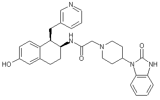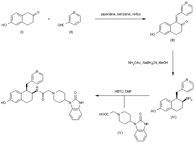 Aldol condensation of 3-pyridinecarboxaldehyde (II) with tetralone (I) in the presence of piperidine provided unsaturated ketone (III). This was subjected to reductive amination with ammonium formate and sodium cyanoborohydride to give the cis-aminotetralin (IV). Finally, amine (IV) was coupled with [4-(2-oxo-1-benzimidazolinyl)piperidin-1-yl]acetic acid (V) using HBTU.