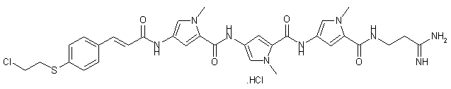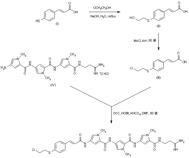 Reaction of 4-mercaptocinnamic acid (I) with 2-chloroethanol in the presence of NaOH afforded the hydroxyethyl sulfide (II), which was converted into the chloroethyl derivative (III) upon treatment with mesyl chloride and 37% HCl in hot pyridine. Coupling of carboxylic acid (III) with desformyldistamycin (IV) by means of DCC and HOBt gave rise to the title amide.