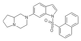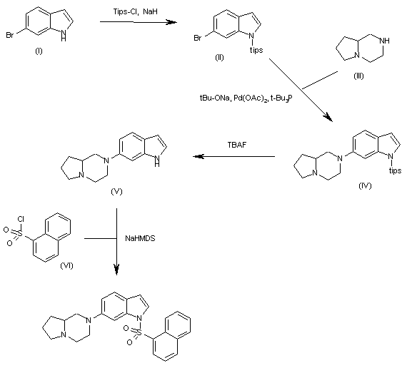 The reaction of 6-bromo-1H-indole (I) with Tips-Cl and NaH in DMF gives the N-silylated indole (II), which is condensed with 1,4-diazabicyclo[4,3,0]nonane (III) by means of tBu-ONa, Pd(OAc)2 and tBu3P in hot xylene to yield the corresponding adduct (IV). The desilylation of (IV) by means of TBAF in THF affords the deprotected indole (V), which is finally sulfonated with 1-naphthylsulfonyl chloride and NaHMDS in THF.