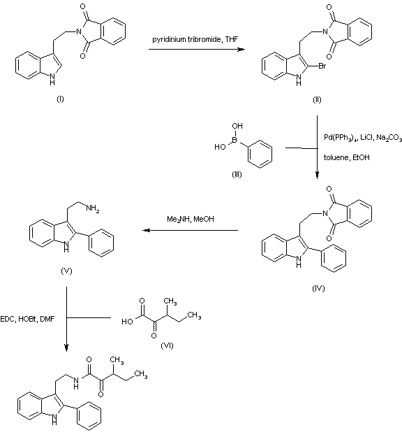 Bromination of N-phthaloyl tryptamine (I) with pyridinium tribromide provided the 2-bromo indole (II). Suzuki coupling of bromide (II) with phenylboronic acid (III) gave the 2-phenyl indole (IV). The phthaloyl group of (IV) was then removed by treatment with dimethylamine to furnish 2-phenyltryptamine (V). Then condensation of amine (V) with 3-methyl-2-oxovaleric acid (VI) using EDC and HOBt yielded the corresponding amide.