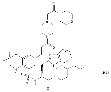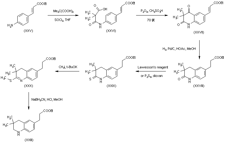An alternative procedure for the preparation of tetrahydroquinoline (XXIII) consisted in the acylation of ethyl 4-aminocinnamate (XXV) with the in situ prepared dimethylmalonyl chloride (to give (XXVI)), followed by cyclization to the quinoline dione (XXVII) by means of phosphorus pentoxide and methanesulfonic acid. The hydrogenation of the double bond of (XXVII) and simultaneous reduction of the keto group produced quinolinone (XXVIII). Further reduction of the lactam carbonyl group of (XXVIII) to provide (XXIII) was carried out via conversion to thiolactam (XXIX), which was alkylated with iodomethane to the S-methyl thioimidate (XXX) and then reduced with NaBH3CN.