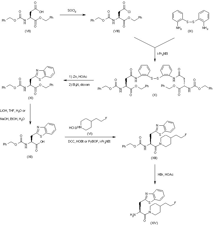 Amine intermediate (XIV) has been obtained as follows: N-(Carbobenzoxy)-L-aspartic acid alpha-benzyl ester (VII) was converted to acid chloride (VIII) and then coupled to 2-aminophenyl disulfide (IX) to afford the bis-amide (X). Reductive cleavage of the disulfide group of (X), followed by basic cyclization, produced the benzothiazole (XI) (2). Hydrolysis of the benzyl ester group of (XI) and subsequent coupling of the resulting carboxylic acid (XII) with piperidine (VI) gave amide (XIII). The carbobenzoxy group of (XII) was then cleaved with HBr in HOAc, yielding intermediate amine (XIV).