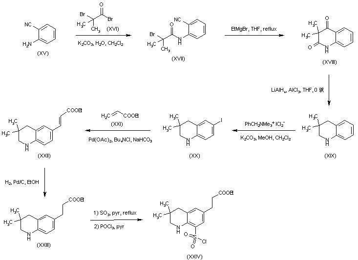 2-Aminobenzonitrile (XV) was acylated with 2-bromoisobutyryl bromide (XVI) to afford the cyano amide (XVII). Halogen-metal exchange with ethylmagnesium bromide followed by intramolecular addition to the cyano group of (XVII) gave rise to the quinoline dione (XVIII). This was reduced to the tetrahydroquinoline (XIX) by means of LiAlH4 and AlCl3. Iodination of (XIX) with benzyltrimethylammonium iodine dichloride furnished (XX), which was coupled with ethyl acrylate (XXI) in the presence of palladium acetate, yielding the unsaturated ester (XXII). After catalytic hydrogenation of the olefin (XXII) to propionyl ester (XXIII), sulfonation and treatment with POCl3, intermediate sulfonyl chloride (XXIV) was obtained.