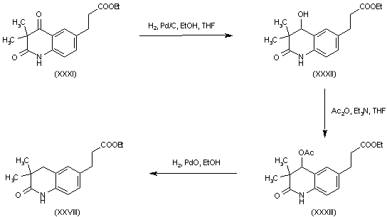 Quinolinone (XXVIII) was also obtained by reduction of quinoline dione (XXXI) to alcohol (XXXII), followed by esterification to acetate (XXXIII) and hydrogenolysis of the acetoxy group in the presence of palladium oxide.