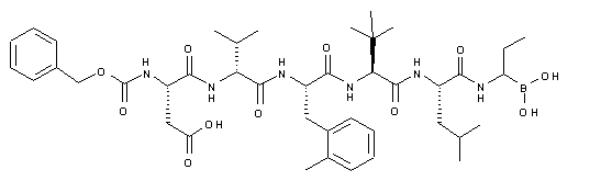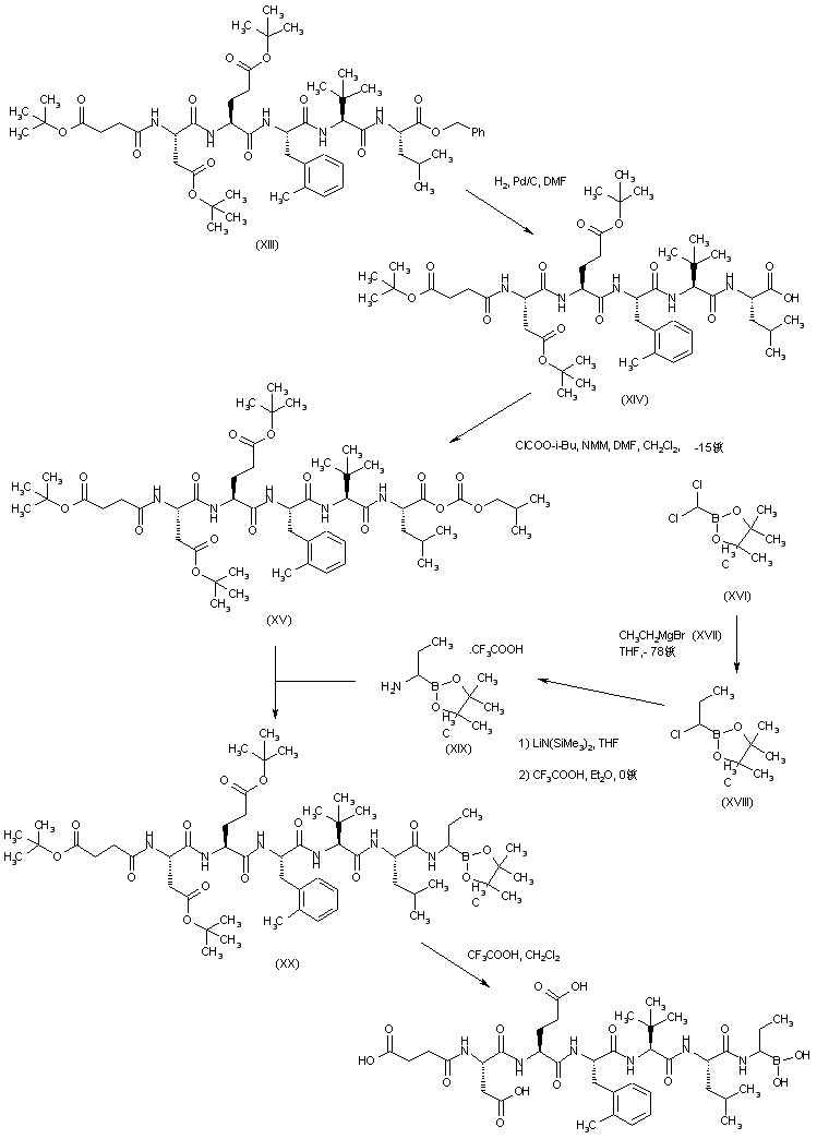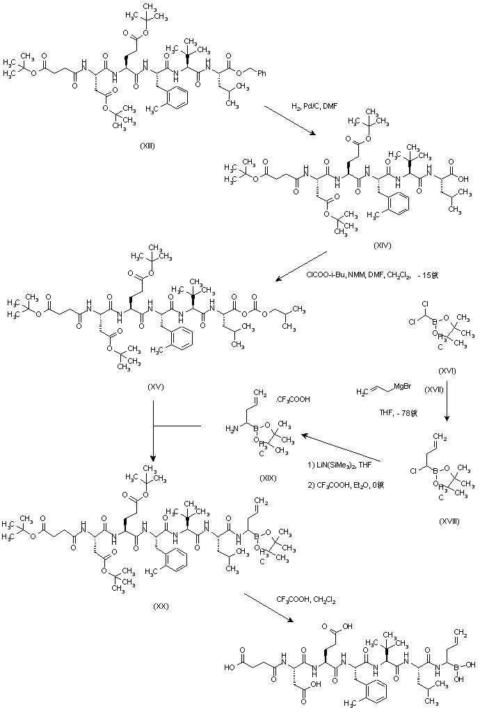 Hydrogenolysis of the benzyl ester of (XIII) over Pd/C gave peptide acid (XIV), which was converted to the mixed anhydride (XV) using isobutyl chloroformate and N-methylmorpholine. (Aminobutenyl)- dioxaborolane (XIX) was obtained by treatment of the (dichloromethyl)dioxaborolane (XVI) with allylmagnesium bromide (XVII), and subsequent displacement of the remaining chlorine atom with lithium bis(trimethylsilyl)amide. Condensation of anhydride (XV) with racemic aminoborolane (XIX) produced (XX) as a diastereomeric mixture. Finally, removal of the tert-butyl esters and hydrolysis of the dioxaborolane to the target boronic acid was effected with trifluoroacetic acid in CH2Cl2.