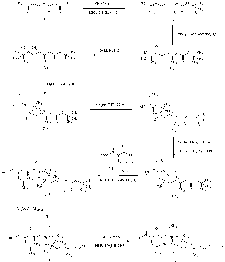 The title compound was prepared by solid phase peptide synthesis. The dioxoborolane-linked resin (XI) was obtained as shown in Scheme 1. 3,7-Dimethyl-6-octenoic acid (I) was protected as the tert-butyl ester (II) by treatment with isobutylene and sulfuric acid, and subsequently oxidized with KMnO4 to afford the hydroxy ketone (III). Addition of methylmagnesium bromide to the keto group of (III) provided diol (IV), which upon reaction with dichloromethyl diisopropoxyborane furnished dioxaborolane (V). Displacement of one chlorine group of (V) with ethylmagnesium bromide at -78 C gave rise to the chloropropyl dioxaborolane (VI). The remaining chlorine atom of (VI) was displaced with lithium bis(trimethylsilyl)amide to yield, after acid desilylation, amine (VII). This was coupled with N-Fmoc-L-leucine (VIII) via the mixed anhydride with isobutyl chloroformate to give amide (IX). After cleavage of the tert-butyl ester of (IX) with trifluoroacetic acid, the resulting carboxylic acid (X) was coupled to the 4-methylbenzhydrylamine resin by means of 2-benzotriazolyl-1,1,3,3-tetramethyluronium hexafluorophosphate (HBTU), yielding resin (XI).