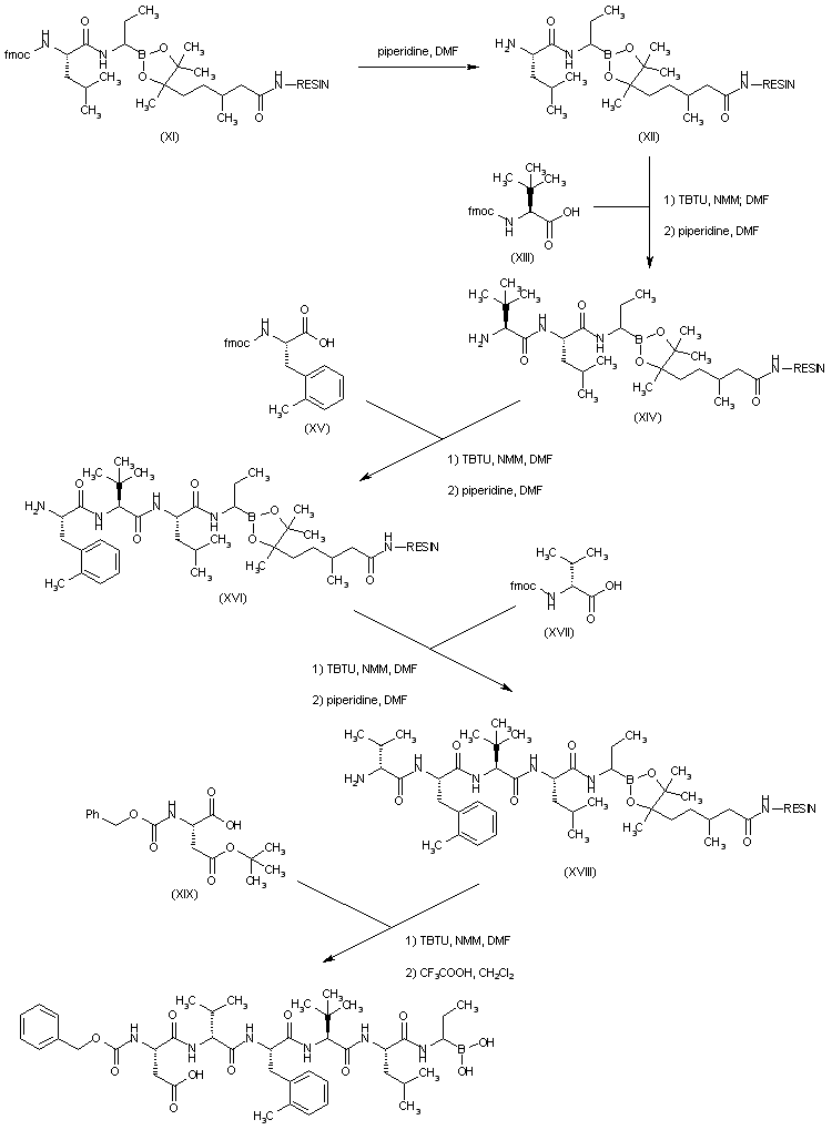 Hydrogenolysis of the benzyl ester of (XIII) over Pd/C gave peptide acid (XIV), which was converted to the mixed anhydride (XV) using isobutyl chloroformate and N-methylmorpholine. (Aminopropyl)- dioxaborolane (XIX) was obtained by treatment of the (dichloromethyl)dioxaborolane (XVI) with ethylmagnesium bromide (XVII), and subsequent displacement of the remaining chlorine atom with lithium bis(trimethylsilyl)amide. Condensation of anhydride (XV) with racemic aminoborolane (XIX) produced (XX) as a diastereomeric mixture. Finally, removal of the tert-butyl esters and hydrolysis of the dioxaborolane to the target boronic acid was effected with trifluoroacetic acid in CH2Cl2.