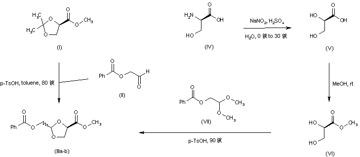 Ketal exchange between the chiral acetonide (I) and 2-(benzoyloxy)acetaldehyde (II) under acidic conditions affords the 2-(benzoyloxymethyl) dioxolane (III) as a diastereomeric mixture. Alternatively, diazotization of D-serine (IV) in the presence of NaNO2 and H2SO4 produces D-glyceric acid (V), which is further esterified with methanol to afford the methyl ester (VI). Condensation of dihydroxy ester (VI) with 2-(benzoyloxy)acetaldehyde dimethyl acetal (VII) then gives dioxolane (III).