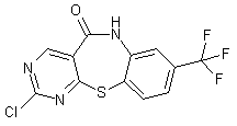 Reduction of nitrothiophenol (I) by hydrogenation over Pd/C in THF affords substituted aniline (II), which is then cyclized with 2,4-dichloropyrimidine-5-carbonyl chloride (III) in THF in the presence of Amberlyst A-27 to yield the final product.