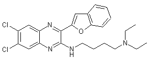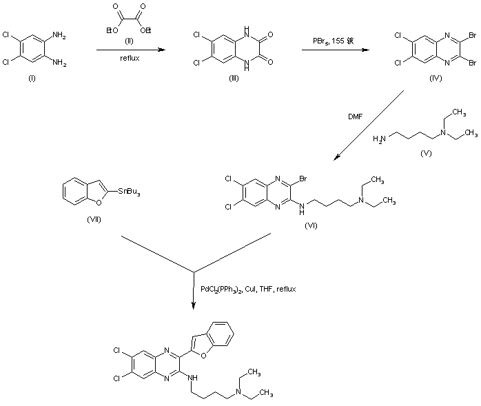 The condensation of 4,5-dichloro-1,2-phenylenediamine (I) with diethyl oxalate (II) produced quinoxalinedione (III), which was brominated with PBr5 at 155 C to afford the dibromo derivative (IV). Displacement of one bromine group of (IV) with 4-(diethylamino)butylamine (V) furnished (VI). The remaining bromine of (VI) was then displaced with 2-(tributylstannyl)benzofuran (VII) to produce the title compound.