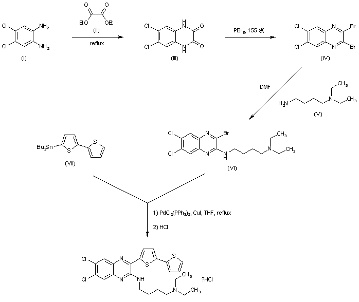 The condensation of 4,5-dichloro-1,2-phenylenediamine (I) with diethyl oxalate (II) produced quinoxalinedione (III), which was brominated with PBr5 at 155 C to afford the dibromo derivative (IV). Displacement of one bromine group of (IV) with 4-(diethylamino)butylamine (V) furnished (VI). The remaining bromine of (VI) was then displaced with 5-(tributylstannyl)-2,2'-bithienyl (VII) to produce the title compound, isolated as the corresponding hydrochloride salt.
