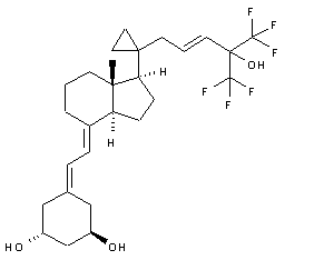 | 合成路线图解说明: The dimethylaluminium chloride-catalyzed addition of formaldehyde to the isopropenyl derivative (I) produced the homoallylic alcohol (II). The cyclopropane ring was then constructed over (II) by the Simmons-Smith procedure using diiodomethane and diethylzinc. The resulting cyclopropylethyl alcohol (III) was oxidized to aldehyde (IV) with pyridinium chlorochromate in CH2Cl2, and subsequent addition of diethyl azomethylphosphonate generated the terminal acetylene (V). The lithium acetylide of (V) was then added to hexafluoroacetone (VI), producing the propargylic alcohol (VII). Cleavage of the silyl protecting group with fluorosilicic acid liberated the secondary alcohol (VIII), which was further oxidized to ketone (IX) employing pyridinium dichromate. Condensation of this ketone (IX) with the ylide resulting from phosphine oxide (X) and n-butyllithium at low temperature produced the silylated cholecalciferol analogue (XI). Finally, desilylation with tetrabutylammonium fluoride gave the title compound. |