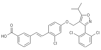 2,6-Dichlorobenzaldehyde (I) was converted to oxime (II) and then chlorinated with N-chlorosuccinimide to afford the oximidoyl chloride (III). The cycloaddition reaction between ketoester (IV) and the nitrile oxide resulting from (III) in the presence of NaOMe gave rise to the isoxazole system (V). The ester group of (V) was then reduced to alcohol (VI) employing diisobutylaluminium hydride. Subsequent coupling of alcohol (VI) with 2-chloro-4-hydroxybenzaldehyde (VII) under Mitsunobu conditions provided ether (VIII). Phosphonate (X) was prepared by heating methyl 3-(bromomethyl)benzoate (IX) with triethyl phosphite at 185 C. Horner-Emmons condensation of aldehyde (VIII) with phosphonate (X) in the presence of NaH in THF furnished the stilbene derivative (XI). The methyl ester group of (XI) was finally hydrolyzed by means of LiOH in aqueous THF.