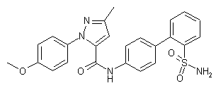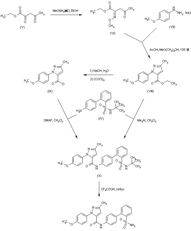 Ethyl 2,4-dioxopentanoate (V) was converted into the O-methyloxime (VI) and subsequently cyclized with 4-methoxyphenylhydrazine (VII) to furnish pyrazole (VIII) (1,2). Optionally, ester (VIII) was hydrolyzed and then converted to acid chloride (IX) by treatment with oxalyl chloride (1). Biphenylamine (IV) was coupled with ester (VIII) in the presence of trimethylaluminium (2) or, alternatively, with acid chloride (IX) (1) to give amide (X). The N-tert-butyl group of (X) was finally removed by refluxing in trifluoroacetic acid.