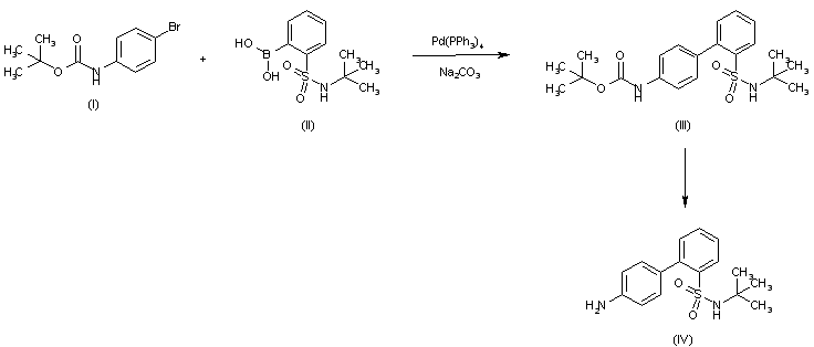 The intermediate biphenylamine (IV) was prepared by Suzuki coupling of N-Boc-4-bromoaniline (I) with 2-(N-tert-butylaminosulfonyl)phenylboronic acid (II), followed by deprotection of the Boc group.