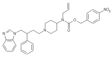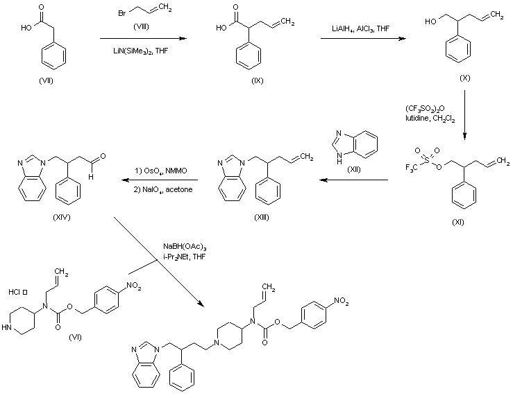 Alkylation of phenylacetic acid (VII) with allyl bromide (VIII) using lithium bis(trimethylsilyl)amide furnished 2-phenyl-4-pentenoic acid (IX). Reduction of the carboxylate group of (IX) by means of LiAlH4 and AlCl3 gave rise to alcohol (X), which was subsequently converted to triflate (XI). The triflate group of (XI) was then displaced with benzimidazole (XII) to produce adduct (XIII). Dihydroxylation of the double bond of (XIII) with N-methylmorpholine-N-oxide in the presence of OsO4, followed by oxidative cleavage with NaIO4, yielded aldehyde (XIV). Finally, aldehyde (XIV) was reductively condensed with piperidine (VI) in the presence of sodium triacetoxyborohydride.