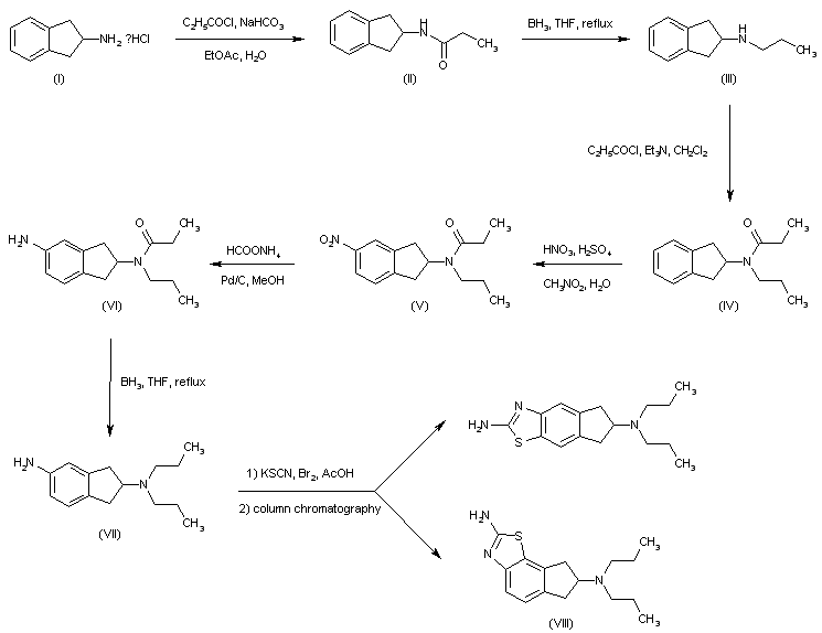 After acylation of 2-aminoindan (I) with propionyl chloride, the resulting propionamide (II) was reduced with borane to the amine (III). Further acylation of (III) with propionyl chloride furnished amide (IV). Nitration of (IV), followed by transfer hydrogenation of nitro derivative (V), gave rise to aniline (VI). Reduction of the amide function of (VI) with borane yielded diamine (VII). Subsequent reaction of aniline (VII) with thiocyanogen, generated from KSCN and Br2, provided the desired benzothiazole along with the regioisomeric analogue (VIII), which were separated by column chromatography.