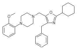 Coupling of piperazine (I) with chloro derivative (II) by means of K2CO3 and KI in acetone affords protected compound (III), which is then condensed with acid chloride (IV) by means of n-BuLi in THF to yield amide (V). Deprotection of (V) by hydrogenation over Pd/C in EtOH provides (VI), which is finally cyclized by treatment with POCl3 in DMF. Alternatively, the synthesis of the target product can be achieved by an analogous route: Acylation of amine (VII) with acid chloride (IV) by means of K2CO3 in CH2Cl2 provides amide (VIII), which is then cyclized by heating with POCl3 in DMF/benzene to give oxazole (IX). Finally, (IX) is condensed with piperazine (I) by means of K2CO3 and KI in acetone.