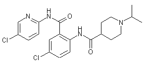 The condensation between 5-chloro-2-nitrobenzoyl chloride (I) and 2-amino-5-chloropyridine (II) produced the corresponding amide (III). Subsequent catalytic hydrogenation of the nitro group of (III) gave aniline (IV). Acid chloride (VI), prepared from N-Boc-isonipecotic acid (V) and oxalyl chloride, was then coupled to aniline (IV) to furnish amide (VII). Further trifluoroacetic acid-promoted cleavage of the Boc protecting group of (VII) yielded piperidine (VIII). Finally, reductive alkylation with acetone in the presence of sodium triacetoxyborohydride gave rise to the target N-isopropyl piperidine.