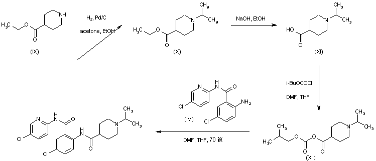 An alternative preparation for the title compound consisted in the reductive alkylation of ethyl isonipecotate (IX) with acetone to afford the N-isopropyl isonipecotate (X). After basic hydrolysis of the ethyl ester group of (X), the resulting carboxylic acid (XI) was activated as the mixed anhydride (XII) with isobutyl chloroformate. Anhydride (XII) was finally coupled to aniline (IV) to generate the required amide.