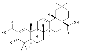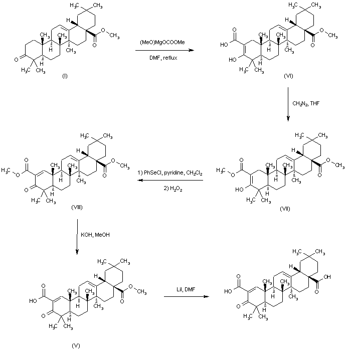 Formylation of methyl 3-oxooleanolate (I) with ethyl formate and NaOMe afforded the (hydroxymethylene)derivative (II). The unsaturated aldehyde (IV) was prepared by selenylation of (II) with phenylselenyl chloride and pyridine, followed by oxidation of the resulting selenide (III) with H2O2 with concomitant elimination of the resulting selenoxide. Jones oxidation of aldehyde (IV) afforded carboxylic acid (V). Finally, hydrolysis of the hindered methyl ester group of (V) was achieved by treatment with lithium iodide in refluxing DMF.
