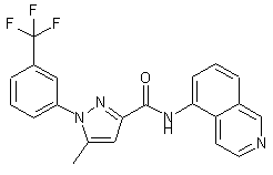 Cyclization of ethyl 2,4-dioxovalerate (I) with 3-(trifluoromethyl)phenylhydrazine (II) in a refluxing mixture of HOAc and 2-methoxyethanol produced pyrazole ester (III). After saponification of the ethyl ester group of (III), the resulting carboxylic acid (IV) was coupled to 5-aminoisoquinoline (V) by using O-(7-azabenzotriazol-1-yl)-N,N,N',N'-tetramethyluronium hexafluorophosphate to furnish the corresponding amide.