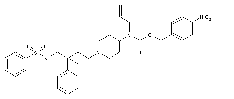 Reductive amination of N-Boc-4-piperidone (I) with allyl amine (II) in the presence of sodium triacetoxyborohydride gave aminopiperidine (III), which was condensed with 4-nitrobenzyl chloroformate (IV) to afford carbamate (V). The Boc group of (V) was then cleaved by treatment with methanolic HCl to produce intermediate piperidine (VI). Alternatively, the condensation of 1-Boc-piperidine-4-amine (VII) with chloroformate (IV) gives carbamate (VIII), which is allylated with allyl chloride (IX) and NaH in THF, yielding the already reported carbamate (V).