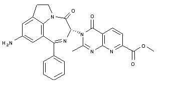 | 合成路线图解说明: 3(R)-Amino-1-phenyl-6,7-dihydro-3H-[1,4]diazepin[6,7,1-hi]indol-4-one (I) was nitrated using KNO3 in concentrated H2SO4 to furnish the 9-nitro derivative (II). Coupling of (II) with 2-amino-6-(methoxycarbonyl)pyridine-3-carboxylic acid (III) in the presence of DCC and HOBt gave amide (IV). Imidate (V) was prepared by heating (IV) with trimethyl orthoacetate under vacuum distillation of the generated MeOH. Cyclization of (V) to produce the target pyridopyrimidine system (VI) was achieved using scandium triflate as the catalyst. The nitro group was finally hydrogenated over Ru/C to yield the title amino derivative. |