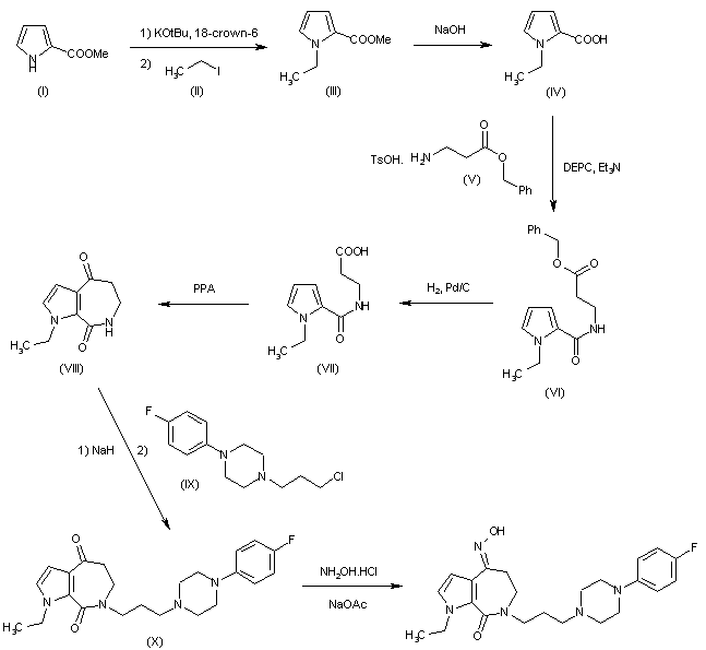 Treatment of methyl pyrrole-2-carboxylate (I) with KOtBu and 18-crown-6 in Et2O, followed by reaction with ethyl iodide (II) in Et2O, yields methyl 1-ethylpyrrole-2-carboxylate (III), which is then subjected to saponification with NaOH to afford carboxylic acid (IV). Condensation of (IV) with beta-alanine benzyl ester p-toluene sulfonate (V) in the presence of diethyl phosphorocyanidate (DEPC) and Et3N in DMF provides benzyl ester (VI), which is then hydrogenated over Pd/C in THF, furnishing carboxylic acid (VII). Cyclization of (VII) with polyphosphoric acid (PPA) affords derivative (VIII), which is then treated with NaH in DMF and alkylated with chloro derivative (IX) in DMF to produce compound (X). Finally, treatment of (X) with hydroxylamine hydrochloride and NaOAc affords the target compound.