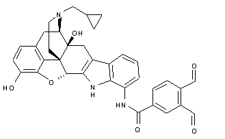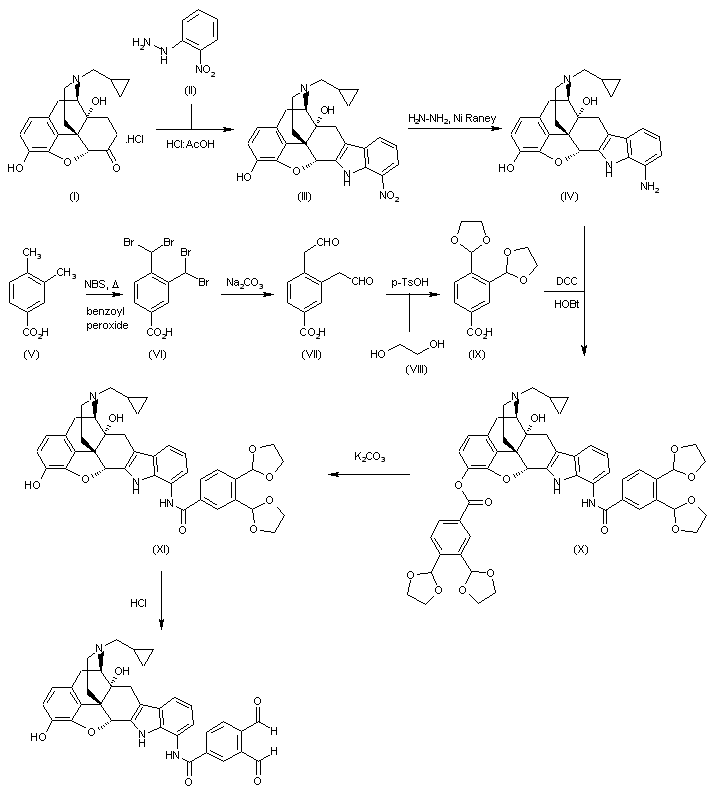 Treatment of naltrexone hydrochloride (I) with 2-nitrophenylhydrazine (II) under Fischer conditions in HCl:HOAc provides nitroindole derivative (III), which is reduced by means of hydrazine and Ni Raney in EtOH to afford amine (IV). Separately, 3,4-dimethylbenzoic acid (V) is brominated with NBS and benzoyl peroxide in refluxing CCl4 to furnish tetrabromo derivative (VI), which is then hydrolyzed with Na2CO3 in H2O to yield 3,4-diformylbenzoic acid (VII). Bis acetalization of (VII) with ethylene glycol (VIII) in benzene in the presence of p-TsOH affords carboxylic acid (IX), which is then coupled with intermediate (IV) by means of DCC and HOBt in DMF to give the corresponding amido ester derivative (X). Selective saponification of (X) with K2CO3 in MeOH affords amide (XI), which is finally converted into the target compound by hydrolysis with HCl in acetone.