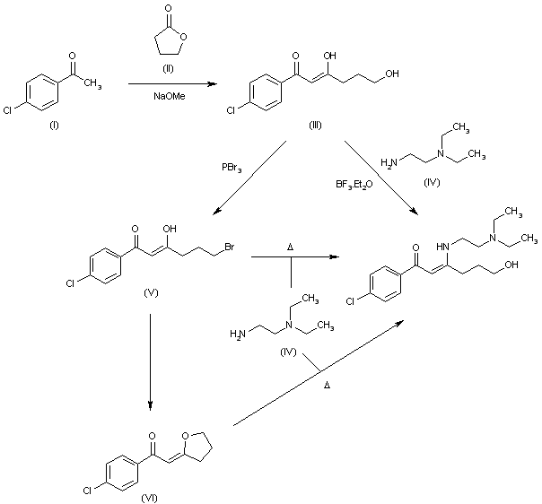 Acetophenone (I) is condensed with gamma-butyrolactone (II) in the presence of NaOMe to afford compound (III), which is finally treated with BF3稥t2O and amine (IV) in dichloromethane/ether. Alternatively, the target compound can be synthesized by regioselective bromination of (III) with PBr3 in dichloromethane to yield bromo derivative (V) followed by heating with primary amine (IV) in MeOH. (Under forceful conditions (V) can be converted into intermediate (VI), which by heating in MeOH in the presence of primary amine (IV) can also lead to the desired product).