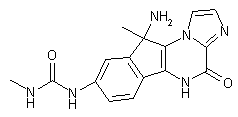 The tetracyclic imidazoindenopyrazinone (IV) was obtained by condensation of 2-bromoindanone (I) with 1-methylimidazole-2-carboxamide (II), followed by demethylation of the resulting imidazolium salt (III) in molten imidazole at 160 C (1). Reaction of (IV) with isoamyl nitrite in the presence of NaH produced oxime (V), which was reduced with zinc powder in acetic acid to yield acetamide (VI). Regioselective methylation of (VI) using methyl iodide and NaH gave (VII). Subsequent nitration of (VII) by means of KNO3 and H2SO4 afforded the 8-nitro derivative (VIII), which was reduced to amine (IX) by hydrogenation over Pd/C. Condensation of amine (IX) with methyl isocyanate in DMF produced urea (X). Finally, the acetamido group of (X) was hydrolyzed in refluxing 6 M HCl.