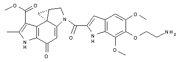 The protection of the OH group of 4-hydroxy-3,5-dimethoxybenzaldehyde (I) with benzyl bromide and K2CO3 DMF gives the benzyl ether (II), which is condensed with ethyl 2-azidoacetate (III) by means of NaOMe in methanol to yield the 2-azido acrylic acid derivative (IV). The cyclization of (IV) in refluxing xylene affords the indole carboxylate (V), which is deprotected by hydrogenation with H2 over PtO2 in THF/methanol to provide 6-hydroxy-5,7-dimethoxy-1H-indole-2-carboxylic acid methyl ester (I). The condensation of (VI) with 1,2-dibromoethane (VII) by means of K2CO3 in DMF gives the 2-bromoethoxy derivative (VIII), which is treated with sodium azide in DMF to yield the 2-azidoethoxy compound (IX). The hydrolysis of the ester group of (IX) with NaOH in THF/water affords the carboxylic acid (X), which is esterified with 4-nitrophenol (XI) by means of DCC and DMAP in dichloromethane to provide the activated ester (XII). The condensation of (XII) with the tetracyclic compound (XIII) by means of NaH in DMF gives the adduct (XIV), which is finally reduced at the azido group with H2 over Pd/C in THF/HOAc to yield the target compound.