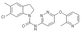Condensation between 3-amino-6-chloropyridazine (I) and 3-hydroxy-2-methylpyridine (II) in aqueous NaOH at 175 C under pressure afforded the bisaryl ether (III). The phenyl carbamate (IV) was then prepared by treatment of aminopyridazine (III) with phenyl chloroformate. Finally, coupling of carbamate (IV) with 6-chloro-5-methylindoline (V) yielded the title urea derivative.