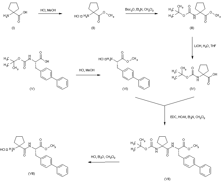 Cycloleucine (I) is esterified with HCl/MeOH, and the resultant amino ester (II) is further protected as the tert-butyl carbamate (III) employing Boc2O and Et3N in CH2Cl2. Then, hydrolysis of the methyl ester group of (III) with LiOH furnishes N-Boc-cycloleucine (IV). N-Boc-L-Biphenylalanine (V) is simultaneously deprotected and esterified with HCl/MeOH to yield amino ester (VI). Coupling between N-Boc-cycloleucine (IV) and L-biphenylalanine methyl ester (VI) in the presence of EDC/HOAt gives rise to the protected dipeptide (VII). Subsequent removal of the N-Boc group of (VII) under acidic conditions yields the dipeptide methyl ester (VIII).