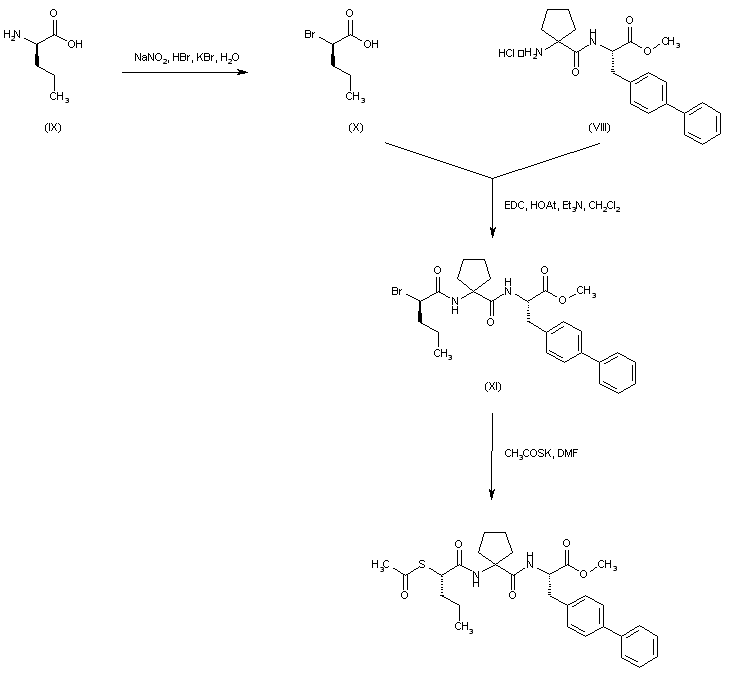 Diazotization of (R)-2-aminopentanoic acid (IX) in the presence of HBr/KBr gives rise to the configuration-retained alpha-bromoacid (X). This is further coupled to the dipeptide ester (VIII) in the presence of EDC/HOAt to furnish the corresponding alpha-bromo amide (XI). Finally, displacement of the bromide group of (XI) with potassium thioacetate in DMF leads to the target thioacetate ester.
