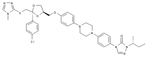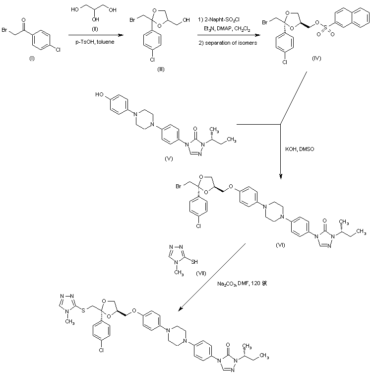 Bromoacetophenone (I) was converted into a cis/trans mixture of ketals (III) by treatment with glycerin (II) and p-toluenesulfonic acid. Subsequent reaction of (III) with 2-naphthalenesulfonyl chloride gave the corresponding mixture of sulfonate esters. After separation of the desired cis-isomer (IV), its condensation with the phenol derivative (V) produced ether (VI). Finally, displacement of the bromine atom of (VI) with 3-mercapto-4-methyl-1,2,4-triazole (VII) using Na2CO3 in DMF gave rise to the title thioether.