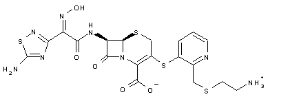 Borane reduction of 3-tert-butylthiopyridine-2-carboxylic acid (X) provided alcohol (XI), which was chlorinated to (XII) with SOCl2 and subsequently displaced with N-Boc-2-mercaptoethylamine (XIII), yielding thioether (XIV). Acid deprotection of the tert-butyl groups of (XIV), followed by air oxidation in the presence of FeCl3, produced the dimeric disulfide (XV). This was reprotected with Boc2O to afford the biscarbamate (XVI). Disulfide (XVI) was reduced in situ with PPh3 to the corresponding thiol, which was coupled with the cephem mesylate (IX) to produce adduct (XVII). The title compound was finally obtained by cleavage of the protecting groups of (XVII) by means of trifluoroacetic acid.