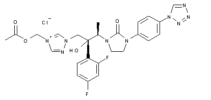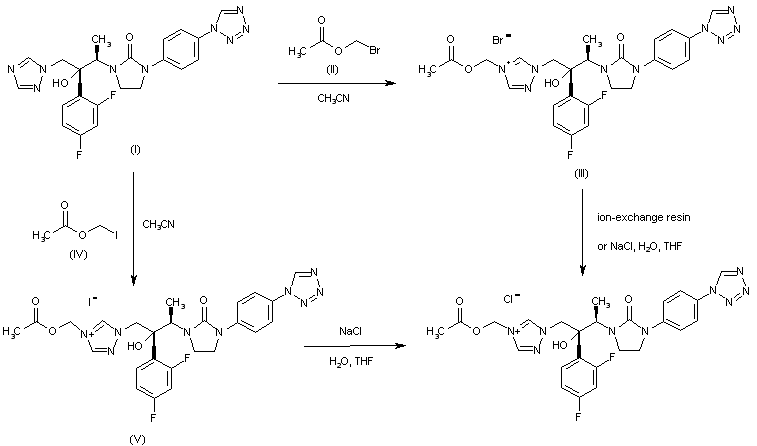 The alkylation of the triazole derivative (I) (compound 293408) with bromomethyl acetate (II) in hot acetonitrile produced the triazolium bromide salt (III). This was then treated either with ion-exchange resin or with a saturated solution of NaCl to produce the desired chloride salt. The analogous alkylation of (I) with iodomethyl acetate (IV) produced the iodide salt (V), which was finally converted to the corresponding chloride by treatment with a saturated solution of NaCl.