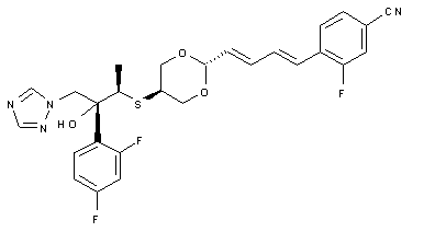 The nitrile (III), a chiral key intermediate of this synthesis, can be obtained by two different synthetic routes as follows: Route-b: The starting material of this route is methyl (S)-3-hydroxy-2-methylpropionate (VIII), which contains one additional carbon between the hydroxyl group and the 2-position carbon of (R)-lactate, the starting material of route-a. The hydroxyl group of (VIII) is protected by triphenylmethyl group. Then, 2,4-difluorophenyl moiety is introduced to give the ketone (X). Direct conversion of the ketone (X) to the oxirane (XIV) by dimethylsulfoxonium methylide, the same condition for compound (IV) in route-a, does not proceed. The oxirane (XIV) having desired stereochemistry is obtained via oxidation reaction. The ketone (X) is converted to the exomethylene (XI) by Wittig reaction. The stereoselective oxidation of (XI) is achieved by means of osmium tetroxide in the presence of 4-methylmorpholine N-oxide to give the diol (XII) in 58% yield after separation of its epimer by column chromatography. After methanesulfonylation of the primary alcohol of (XII), a triazole moiety is introduced and the triphenylmethyl group is deprotected. Then, the primary hydroxyl group of (XVI) is oxidized under Swern oxidation condition to give the aldehyde (XVII), which is converted to the chiral nitrile intermediate (III) by means of heating with hydroxylamine-O-sulfonic acid.