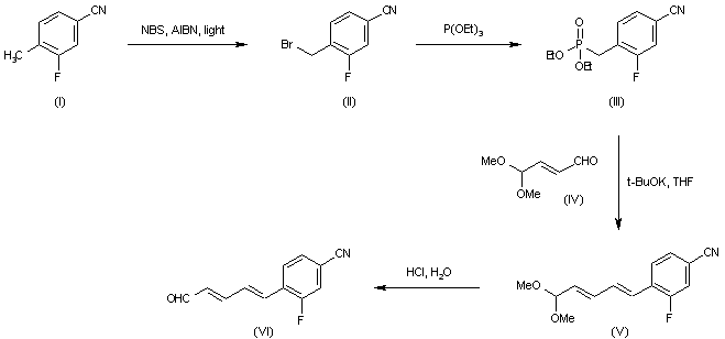 Benzylic bromination of 3-fluoro-4-methylbenzaldehyde (I) using N-bromosuccinimide afforded bromide (II), which was converted to phosphonate (III) by reaction with triethyl phosphite. Horner-Emmons condensation of phosphonate (III) with monoprotected fumaraldehyde (IV) produced the diene acetal (V), which was then hydrolyzed to aldehyde (VI) with aqueous HCl.
