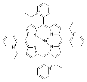 Tetrakis-(2-pyridyl)porphyrin (III) was prepared by condensation between pyridine-2-carboxaldehyde (I) and pyrrole (II) in refluxing propionic acid. Metallation of porphyrin (III) was performed with MnCl2, which spontaneously underwent oxidation, yielding the Mn3+ complex (IV). Subsequent N-alkylation of the pyridine rings with ethyl iodide produced the corresponding pyridinium iodide salt, which was transformed to the analogous chloride by treatment with tetrabutylammonium chloride (1). In an alternative procedure, initial quaternization of the pyridine rings of porphyrin (III) with ethyl p-toluenesulfonate afforded (V), which was further metallated with MnCl2 to give the title compound.